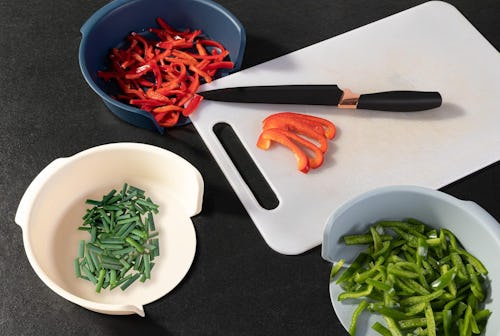 Open Bowls That Slide Under The Cutting Board To Make Food Prep Easy