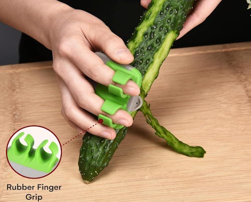 Amazon –These fruit and veggie peelers have a sharp stainless steel blade that makes it easy to take the skin off potatoes, carrots, zucchini — whatever. It has a two-finger ring-style soft rubber grip that protects your hands and fingers from getting scraped or cut so you can do things quickly, effectively, and safely.