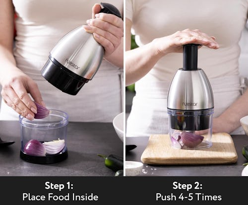 Amazon –Use this veggie chopper to cut up onions, peppers, garlic, and more. It has a 360-degree rotating stainless steel blade with a manual pump that allows you to control how finely things are chopped up. One push of the pump is the equivalent to six knife cuts all at once — what a time-saver. Plus, the whole thing is really easy to clean.