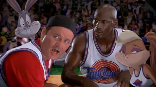 Evil theme park owner Swackhammer (Danny DeVito) tries to kidnap the Looney Tunes for his next attraction, but Bugs Bunny strikes up a deal with the antagonist to allow the Tunes a chance to defend themselves over a basketball game. To secure the win, the characters abduct NBA all-star Michael Jordan to join their team, the Tune Squad.