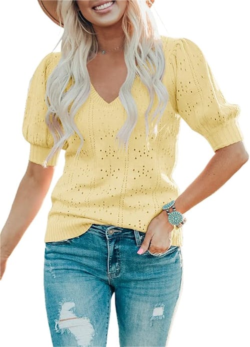 This lovely puff-sleeve shirt is the perfect cross between a blouse and a sweater. It’s made from a lightweight knit material that’s fitting for both warm and cool temperatures. You can choose from two necklines: a V-neck option like the featured image or a crewneck option for a little extra coverage. Both styles come in tons of color choices.