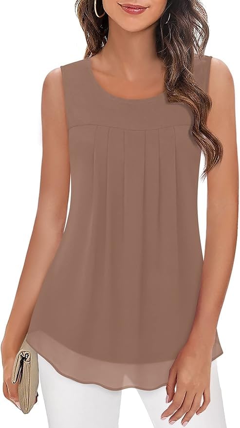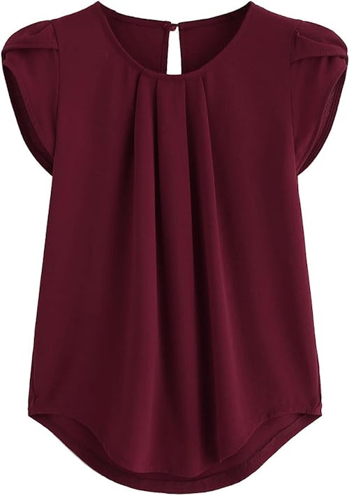 The beauty of this subtly pleated blouse is its versatility. It looks great with jeans, leggings, or business-casual pants. The shirt has a round neck with cap sleeves and a keyhole back. The color options are vibrant, and the fabric is lightweight but not too sheer.