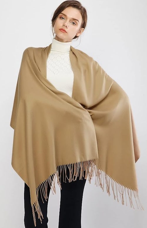 This oversized pashmina shawl comes with options. Wear it as a scarf or shawl in a variety of ways, or use it as a socially acceptable blanket when you’re out and about. The extra-soft pashmina features fringe at the bottom for added texture, and it makes an excellent gift (even if that gift is for yourself).