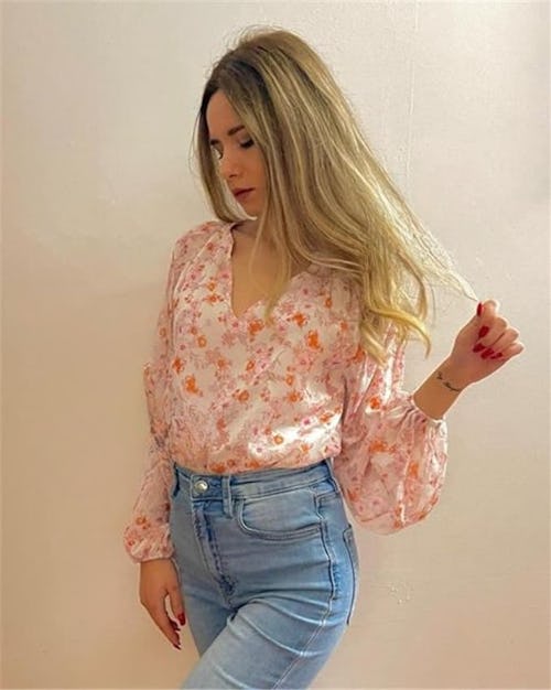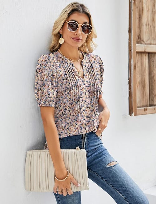 This sweet floral-print blouse features the most adorable puff sleeves. According to shoppers, the textured shirt is soft, true to size, and the elastic on the puff sleeves doesn’t feel constricting. In addition to the short sleeve blouse, the brand also offers a long-sleeve option which is just as cute.