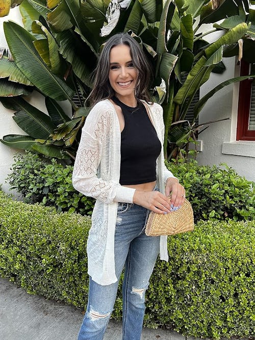 Reach for this lacey sweater when you need a truly lightweight layer. The acrylic knit is thin and soft, with an airy crochet weave that make it ultra-breathable. The drop shoulder eliminates fussing with fit, and it’s long enough for leggings. “One of my favorite layering pieces,” one fan remarked. “I now have it in a couple of different colors.”