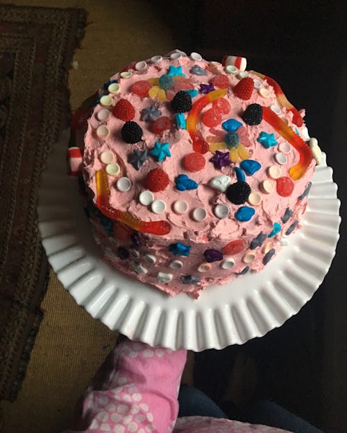 Next to me on the counter was a bucket of leftover candy from Halloween and a bag of penny candy she was sent for her birthday. Candy and cake, maybe that would work? I started adding gummy worms, twirling them around the cake, Skittles, and Smarties and other penny candies and the cake started to come together. The colors were whimsical, making it look like an abstract painting. It was a little kooky, a little kitsch. I patted myself on the back because I’d a solution that was clever, and low-waste but also fun. I wasn’t sure if I wanted to eat it, but how bad could it be?