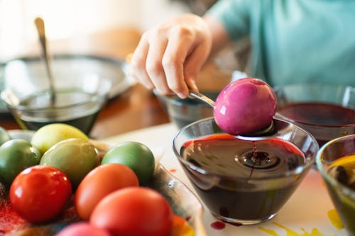 Dyeing Easter eggs is always one of my favorite holiday traditions, and a classic to boot, but let’s be real — I am less than thrilled at the idea of spending $6 on a dozen eggs. And with three kids, you know I need more than 12. We’re talking $18 in eggs that nobody’s going to feel great about eating in a few days when the inside is stained with our purple-dyed fingers.