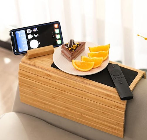 Position this tray table on the arm of almost any sofa, and use it as a handy spot for snacks, the remote control, etc. There’s even a rotating phone stand to prop up your device to watch your favorite videos. The table is made from bamboo with a nonslip pad on top.