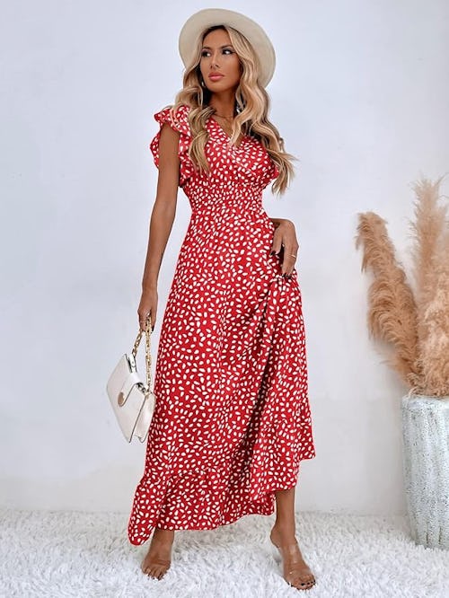 Semi-dressy occasions call for an outfit that’s polished, but not overly formal — like this sweet floral dress, which uses short puffed sleeves and a high crew neckline to add chic yet simple structure. The smocked bodice gives way to a tiered maxi skirt that hits just above the ankle, perfect for showing off your heels.