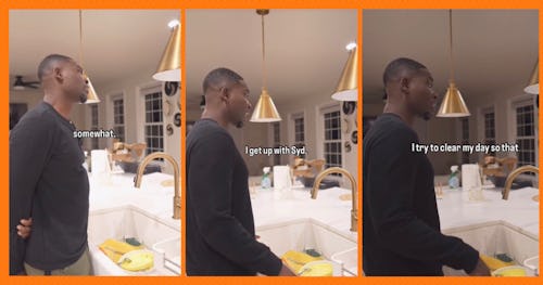 “Syd’s staying home tomorrow. E’s going to school. You take E. I get up with Syd. We do the breakfast thing. I chill with her till you come home. I jump immediately into work. I try to clear my day so that by noon, I can go grab E. Come back. I should be home no later than 2:30. See if I can hop back into work,” he says.