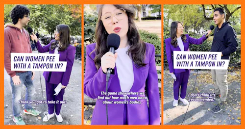 In a series of “Man on the Street” interviews (emphasis very heavily on “man”), host Tiffany Springle asks a series of basic questions about women’s bodies. Like… extraordinarily basic. The kind of thing most of us learn in 5th grade health class. Questions like, “Can women pee while their tampon is in”; “Why there are different types of tampons”; “How many tampons someone would use over the course of their period”; and even the most basic “What is a period?”