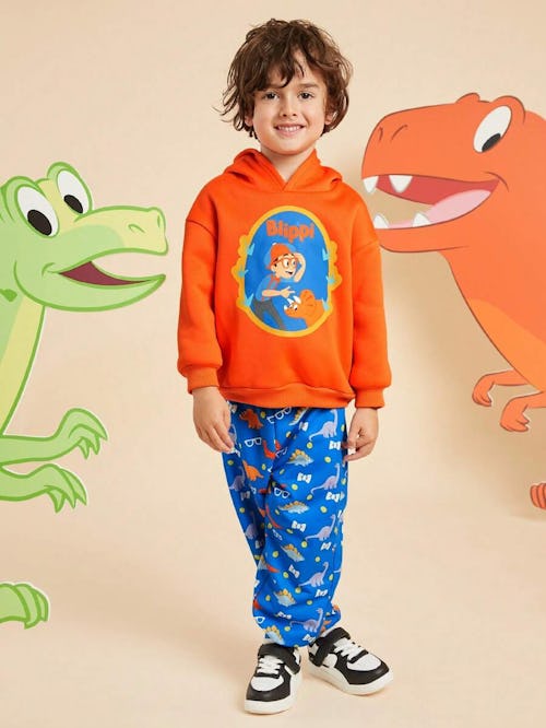 It’s adventure time! This cozy orange hoodie and dino-printed pant-set channels the curiosity of Blippi — and it’s comfy enough for playtime. Perfect for your mini explorer!