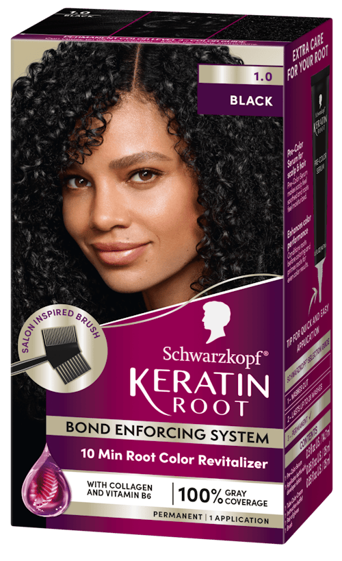 She takes two approaches with gray cover-up, depending on how much time she has and the longevity she needs from the product. Schwarzkopf® Keratin Root 2-in-1 Color and Thickening Spray and Schwarzkopf® Keratin Root Permanent Color Kit have both found a permanent home in her vanity.