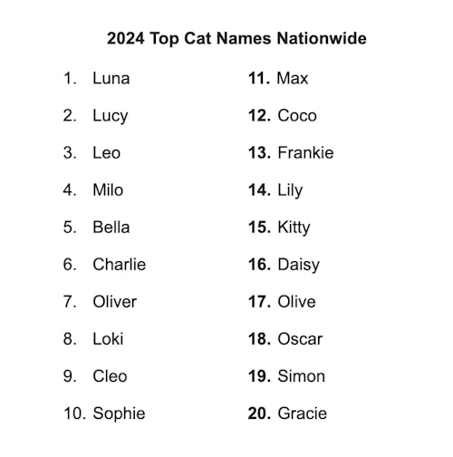 Nevertheless, parallels to the world of baby naming remain: seven top cat names can be found in the Top 20 per the SSA and nine are in the Top 50.