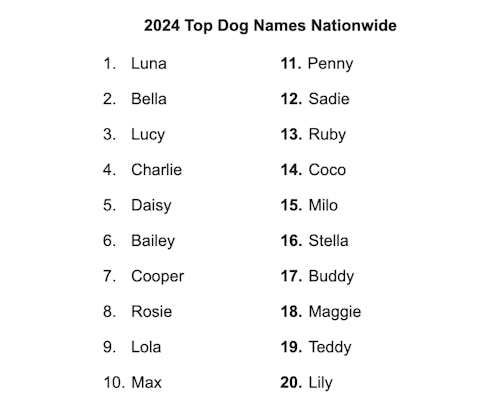 Of the top 20 dog names, 11 were also names in the Top 100 baby names of 2023, the latest year for which we have data. Eight ranked among the Top 50 and five were in the Top 20.