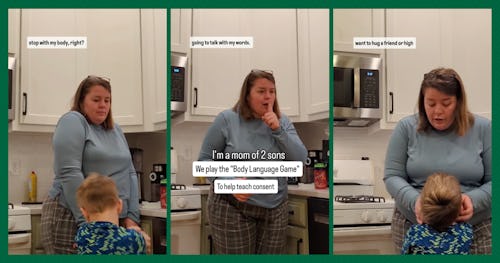 “If I had daughters I would play this game with them too to help teach enthusiastic consent and help practice setting boundaries.,” Pomeroy writes in her caption. “This was only part 1 of a four-part series on the body language game and also using our voice to speak up and say no. We talk about how some people might say yes when they really mean no. Because they feel obligated, or scared, or uncomfortable. So it’s important that we also learn how to read body language and focus on enthusiastic consent. We also reverse the roles so he can practice protecting his own body too. We also practice using our voice to say ‘no’, ‘stop’, and ‘I don’t like that.’”