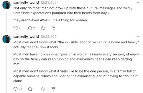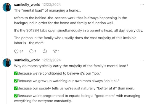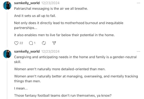 “Most men have ‘mental load privilege’ in the home,” Sam Kelly wrote in a multi-post Thread.