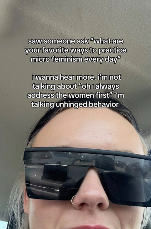 “saw someone ask ‘what are your favorite ways to practice micro feminism every day’ i wanna hear more. i’m not talking about ‘oh i always address the women first’ im talking unhinged behavior,” TikTok account, @phexxi, wrote in text overlay on their video that has racked up over 10 million views and almost 1 million likes.
