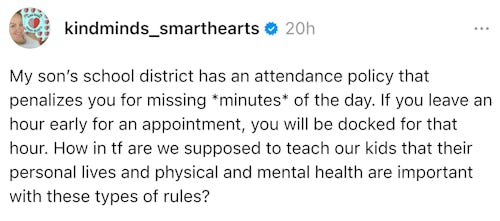 “My son’s school district has an attendance policy that penalizes you for missing *minutes* of the day. If you leave an hour early for an appointment, you will be docked for that hour. How in tf are we supposed to teach our kids that their personal lives and physical and mental health are important with these types of rules?” she asked.