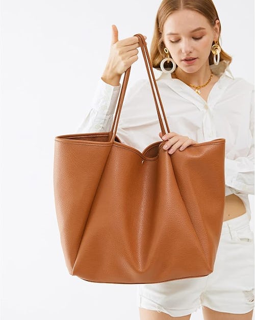 This sleek, oversized tote fits everything from your gym gear to a weekend wardrobe. At 22’’L x 6.5”W x 15”H, it easily handles travel essentials, including those must-have snacks. Made from soft PU leather, it’s sturdy yet lightweight, with a magnetic snap for quick access. Whether you’re commuting or hitting the road, this chic unlined bag keeps it simple and stylish.
