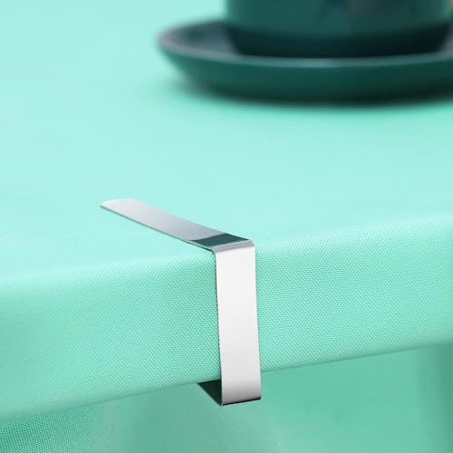 Secure outdoor tablecloths on tables using these heavy-duty stainless steel clamps. They are rust-proof and feature smooth edges to prevent snags to plastic and fabric tablecloths. The clamps are designed to fit most tables with a thickness under 1.4-inches and they are easy to install and remove by pinching and sliding them on and off.