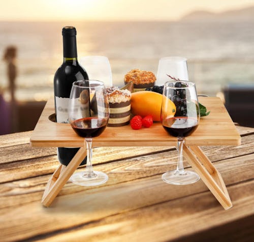 This portable wine picnic table is all you need to enjoy a grown-up backyard picnic; The bamboo table has a built-in bottle holder and two slots for wine glasses, as well as a large surface that doubles as a charcuterie board. The table legs are magnetic and easily removable for easy travel and storage.