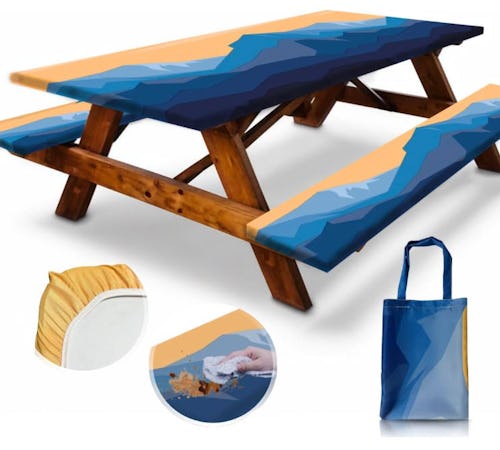 This waterproof polyester picnic table cover fits a six-foot picnic table and is a great way to dress up the backyard fixture. It has a fitted design and flannel backing for a snug fit, and it’s available in multiple colorful designs including classic gingham. The set includes a fitted table cover, two fitted seat covers, and a matching storage bag.