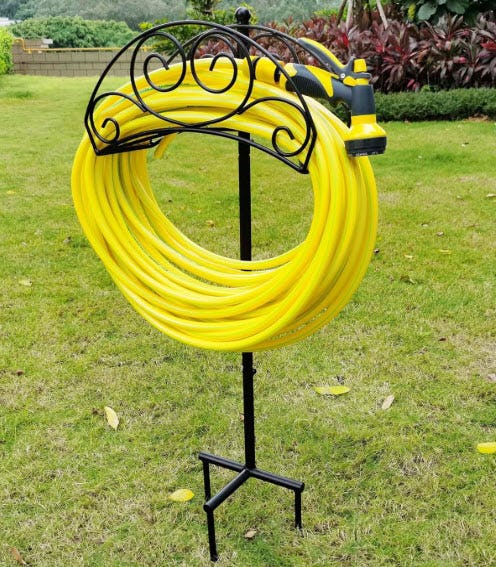 This decorative garden hose holder is an easy way to upgrade your backyard and avoid messy tangles. It’s made from solid steel, features a thick weather-resistant coating, and has three anchor points that secure it in the ground. The decorative design makes it more visually appealing and the freestanding construction offers space-saving storage to declutter the garage or shed.