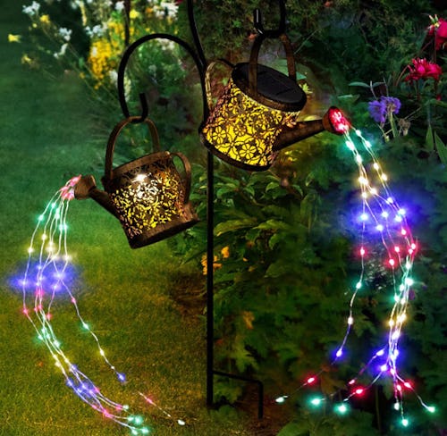 Light up the backyard with an array of vibrant colors coming from these playful solar watering can lights. The metal stand holds two decorative watering cans which cast beautiful shadows and hold six LED light strands each. The lights automatically turn on at dusk, work rain or shine, and offer eight light modes to choose from.