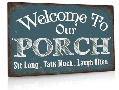 Welcome guests with this whimsical porch sign that encourages long chats and lots of laughter. The metal sign has a distressed texture, rounded corners, and a thick aluminum construction that makes it sturdy and durable. It has two pre-drilled holes for easy hanging, but it can also be mounted using strong double-sided foam tape.