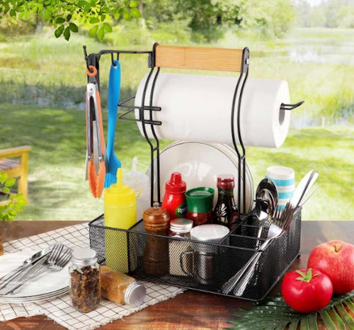 Corral picnic essentials from condiments to utensils in this portable grill caddy. The compact caddy has a clever design and consists of seven individual compartments, a paper towel holder, and three hooks for hanging tools. The black metal construction makes it ultra sturdy and a wood carrying handle makes it easy to grab when you’re heading out to start the grill.