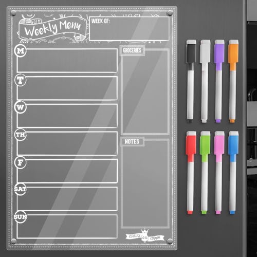 Have a hard time deciding what to eat on a given day? Grab this clear acrylic magnetic planner. It has spots to write down all of your meals for the week — this way, you only have to give brain space to this task once — and there are also extra spots to jot down notes or other grocery needs. This pick is magnetic to attach to your fridge and markers with erasers are included.