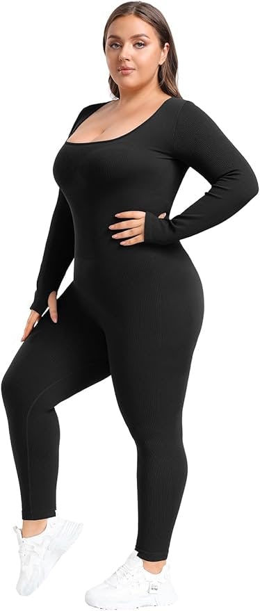 Designed with a trending square neckline, this long-sleeved jumpsuit is bound to get attention if you wear it to the gym — or anywhere else. The clingy ribbed fabric shows off your curves when styled all by itself, or serving as a sleek base layer. Try it with a button-down white shirt on top; the structure will look totally naughty.