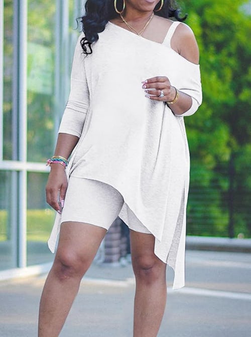 It’s the contrasting silhouettes that give this matching set its sexy, laid-back energy; the body-hugging biker shorts play against a handkerchief hem tunic with an asymmetrical, off-the-shoulder feature to devastating effect. You can even dress up the lounge-ably soft fabric by adding a kitten heel.