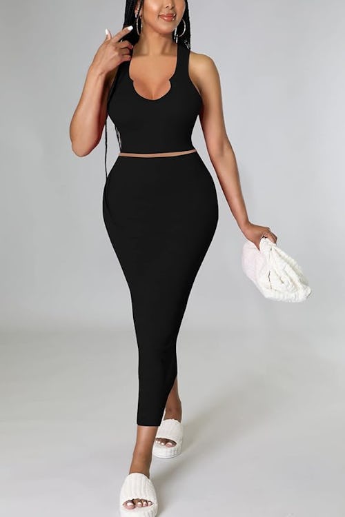Getting your curves on display has never been as effortless as with this matching set. Comprised of a cropped tank with a cleavage-highlighting U-shaped cutout and a bodycon pull-on maxi skirt, the set requires practically zero effort; and it’ll look equally sexy with flats and heels.