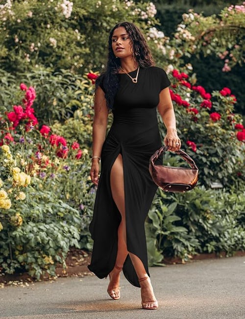 The T-shirt dress gets an ultra-hot twist with the addition of ruched sides and a slit that hits at the top of the thigh — hot details that make the more demure short sleeves and high scoop neckline appear almost cheeky. The stretchy fabric won’t lose its shape, so your look will stay fresh all night long.