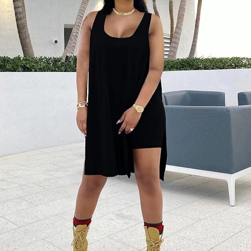 Comprised of a knee-length tunic with front slits that go all the way up to the hip, and body-hugging biker shorts, this lounge set offers major heat without leaving you overly exposed. The square neckline and tank straps combine with an easy fit for a look that’s low-key but still sexy as hell.