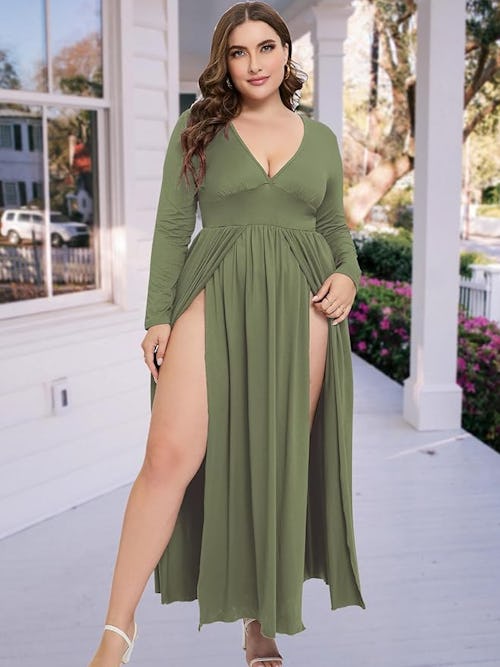 This maxi dress proves just how naughty extra coverage can be: It’s designed with long sleeves and a hem that hits just above the ankle. But with a wide, seamed bodice and deep V-neckline to define your décolletage, as well as double front slits that extend all the way up provide a saucy peek-a-boo moment — it’s hot AF.