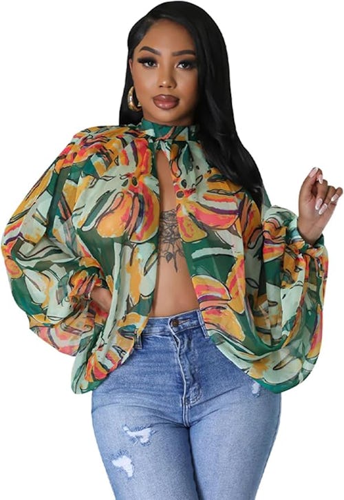 The best part about this open-front top is that it looks hot whether you prefer a look that’s covered or revealing. Designed with a bloused fit, lantern sleeves, and a mock neckline, the sheer printed chiffon is sexy as hell over nothing at all… But you can add a cute bra or tank and achieve a similarly hot effect with wearable coverage.