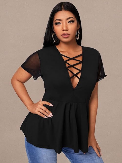 Crafted with details that range from subtle — like sheer mesh short sleeves — to a plunging V-neckline accented by cage straps, this top is bound to get you feeling yourself. In fabric designed with a touch of stretch, the waist drapes gently out to a subtle peplum hem that’s ultra-stylish worn untucked.