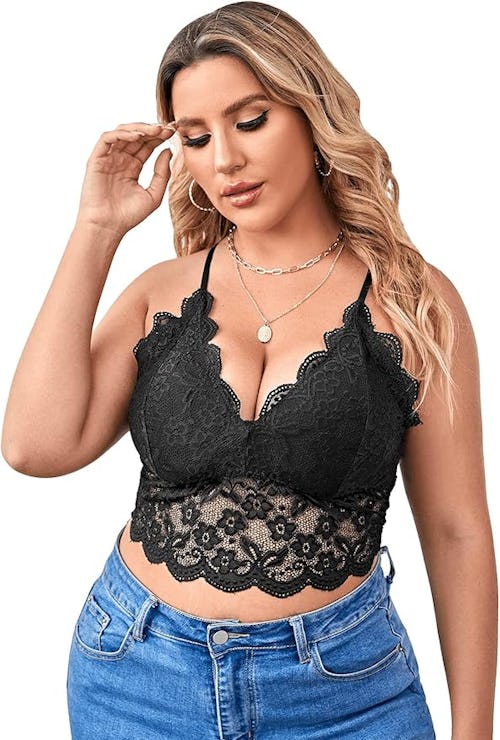 If you’ve been wanting to try the underwear-as-outerwear trend, do it with this bralette. Designed with opaque cups, it’s got just enough coverage — plus a plunging neckline trimmed in scalloped lace to show off your cleavage, and a wide, sheer lace underband offering a little support (and a lot of heat).