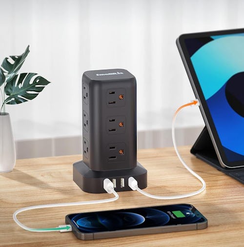 With a sky-high 4.8-star overall rating after 7,500 reviews, this power strip tower has an impressive 12 AC outlets and four USB ports. It’s surge protected and has a 6-foot extension cord plus a space-saving vertical profile.