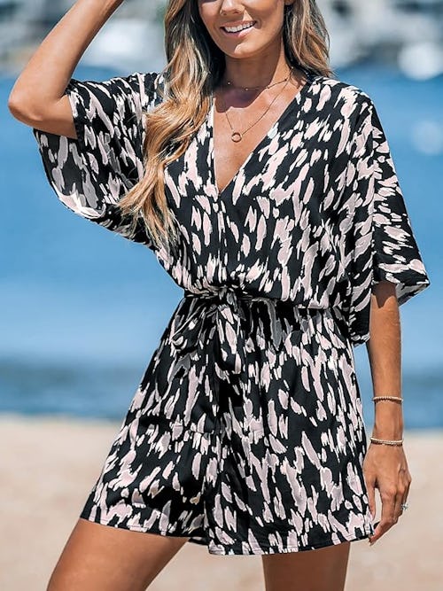 Throw on this printed romper with a pair of flip-flops and you’ll look effortlessly chic with little effort. It’s made entirely from rayon, which reviewers described as “summery and cool,” and its wide elbow-length sleeves, wrap-style V-neck, and flowy silhouette add to its breezy charm. Get it in over a dozen bold, colorful prints and adjust the waist tie as needed for a comfortable fit.