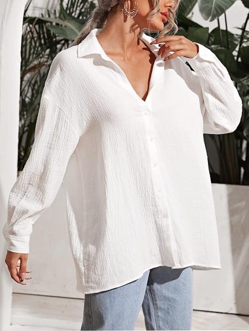 It doesn’t get much more effortlessly chic than this button-down blouse, which is made from a gauzy, linen-like material with dropped shoulders, puffed sleeves, and a boxy silhouette. “Perfect to throw over a swimsuit, shorts and tank top, or to wear with jeans,” wrote one reviewer who said it’s “super comfortable and good quality!”