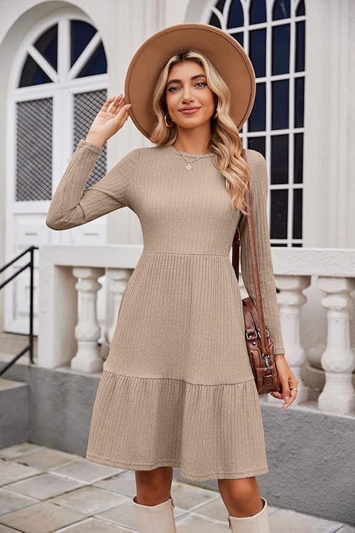With its long sleeves, high neckline, and knee-length hem, this sweater dress offers plenty of modest coverage, but that doesn’t make it any less chic. Its A-line silhouette billows out at the waist into a tiered skirt that goes with virtually any shoes in your closet — plus it has pockets for convenience and a soft, ribbed texture for comfort.