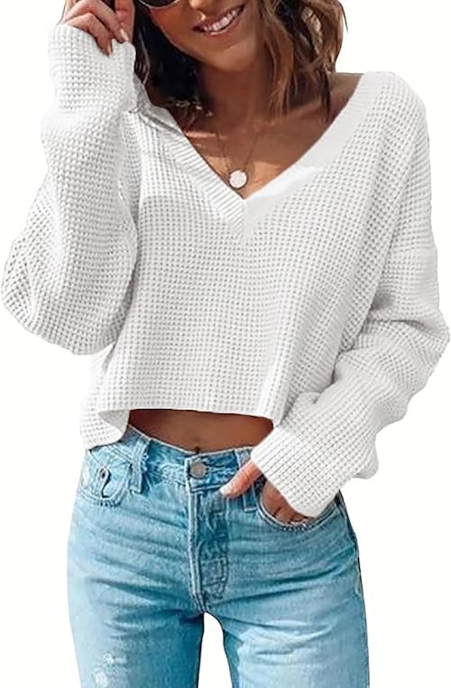 “This has to be one of the best fitting casual tops I own,” one reviewer wrote about this long-sleeve shirt, which contrasts a cozy waffle-knit texture with a trendy cropped cut. While it’s comfortable and breathable enough for lounging, running errands, or the gym, its dropped shoulders and V-neck give it a refined vibe that’s more elevated than your average T-shirt, so you can pair it with jeans and skirts, too.