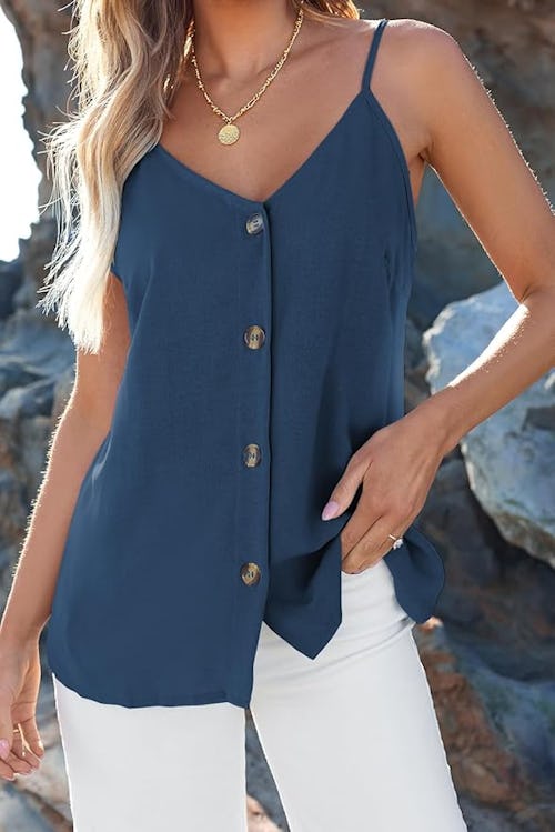 Warm-weather dressing should be all about ease — and this V-neck tank delivers. It has adjustable spaghetti straps and tortoiseshell buttons that keep the look classic but casual. The relaxed fit and 5% spandex construction ensure comfort.