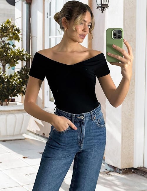 You can channel Grace Kelly — even when wearing jeans — with this off-the-shoulder top. This elegant piece is made with rayon and spandex for a snug fit that reads as totally tailored. The hip-length hem makes it perfect for tucking in and the sophisticated style means you’ll want this on hand for dress-up evenings too.