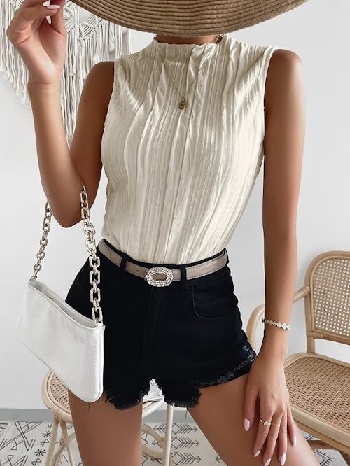 Cowl neck meets turtleneck in this sophisticated tank that almost feels like an art piece. Soft and stretchy, it’s made with polyester, rayon, and spandex with a ruched effect. It’s an elegant pairing with a satin skirt, but low-waisted baggy jeans create a cool contrast.