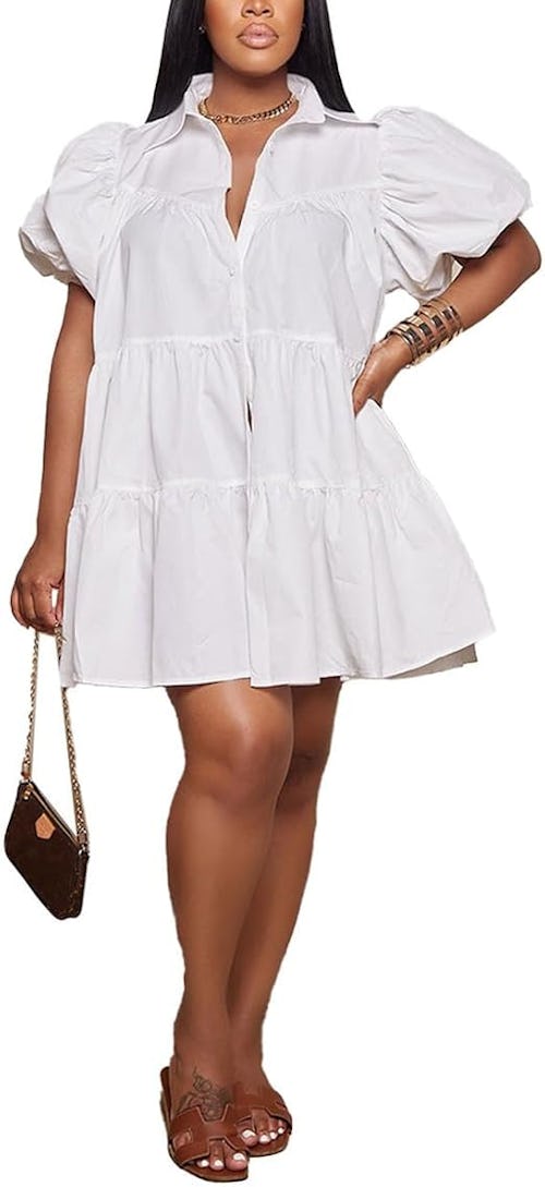 A babydoll dress is inherently charming — but this one also feels grown up and sophisticated, thanks to its button-down design. This collared mini dress has dramatic puff sleeves and layers of ruffles for a swing effect. Just add a necklace and sandals to complete the look.
